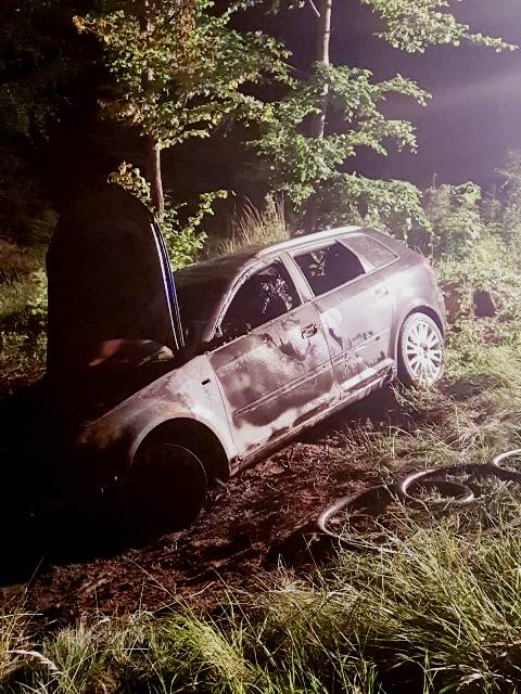 ein PKW - vermutlich nachdem er von der Straße abgekommen war - im Vollbrand.