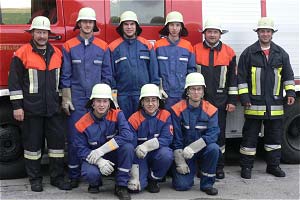 Unser Bild zeigt (v.l.n.r. stehend): 1. Kommandant Franz Mayer, Vitus Ostermair, Florian Mayer, Josef Pletzer, Jugendwart Josef Friedl, Prüfer Norbert Wehle von der FF Pfaffenhofen; knieend: Andreas Dengler, Bernhard Stolz, Hermann Körle jun.